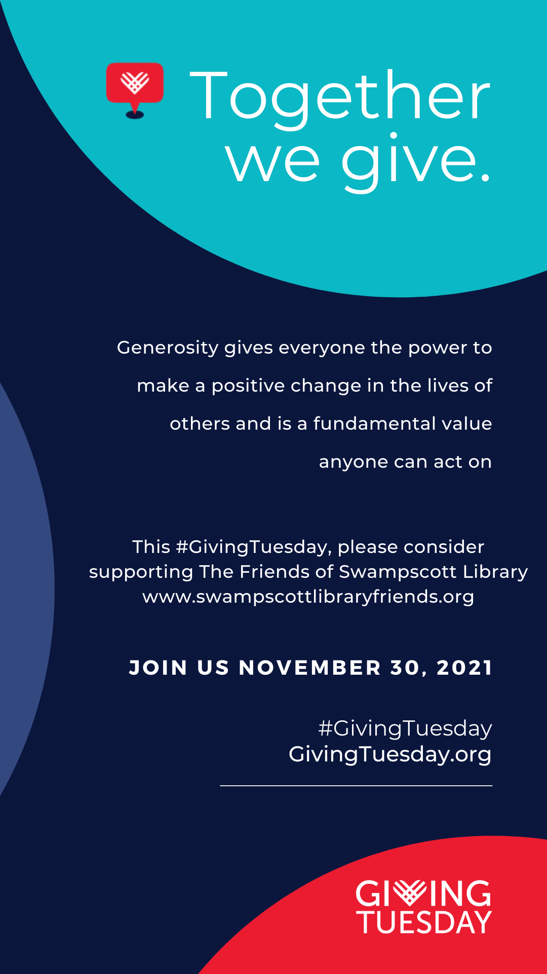 The Friends of Swampscott Public Library is participating in the national day of giving, #GivingTuesday, on November 30. Our annual, end-of-year fund drive will continue throughout the month of December. Please join us in supporting the Library!
