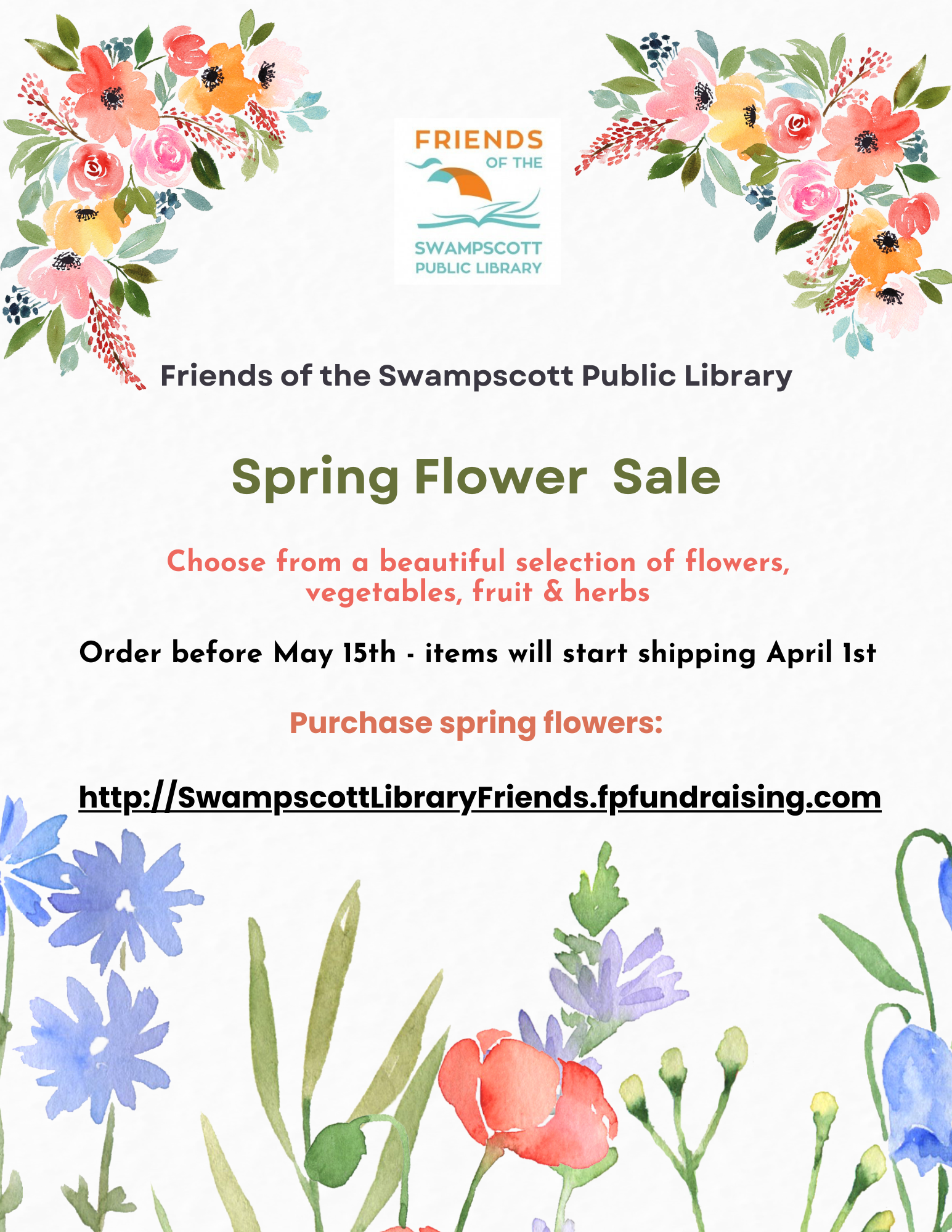 The Friends of Swampscott Public Library are holding a Spring Flower & Plant Sale with proceeds to benefit the Library. Now through May 15, order beautiful flowers, vegetables, fruit and herbs for spring planting at http://SwampscottLibraryFriends.fpfundraising.com